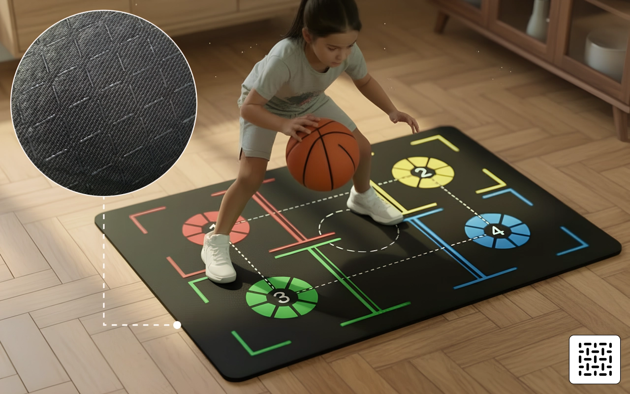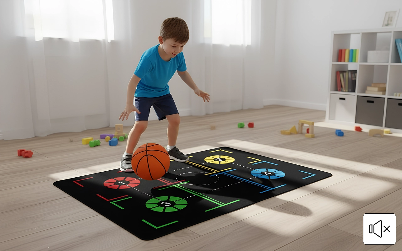 The zones on the mat help me learn where to put my feet. I can practise dribbling quietly at night and not wake my little brother.