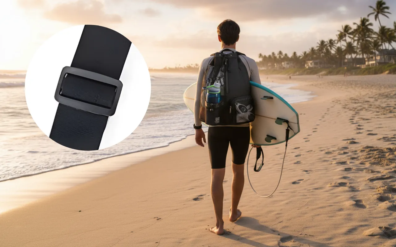 This swimming backpack keeps my gear dry thanks to the strong bottom. I throw it on wet sand and everything inside stays dry.