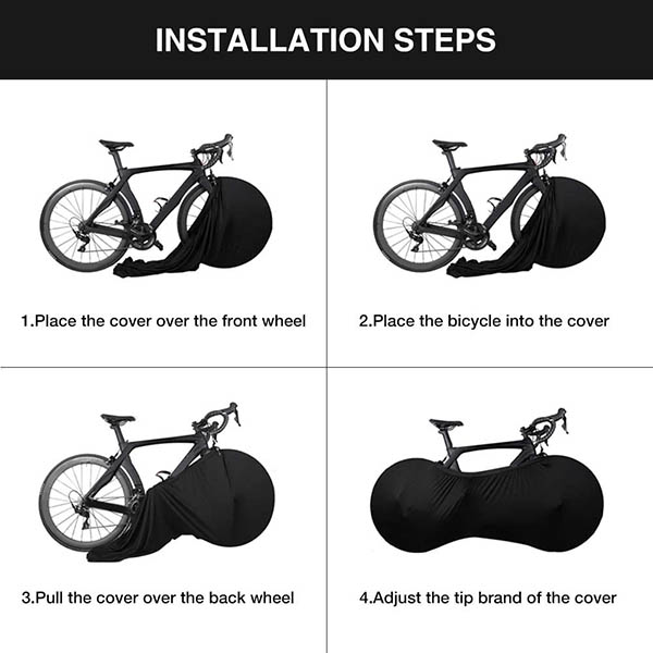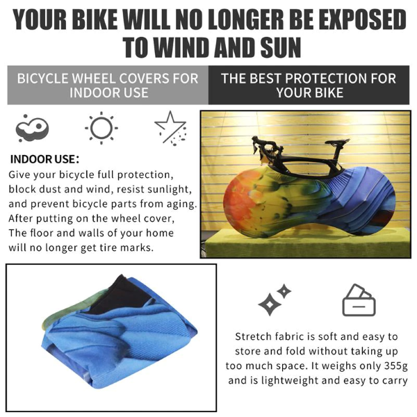 The materials used are elastic that conforms well with the shape of the bike. It reduces flapping and wind dragging noise and provides a tight, secure fit for short or long-term storage. It’s easy to put on and take off in less than a minute. The upper part of the wheel cover adopts high-elastic band binding to avoid slipping. Don’t worry about the installation. Thanks to its flexibility, it is quite easy. These bicycle wheel covers are suitable for tire sizes: 24-26 inches and 27.5 -29 inches. Compatible with most types of bikes such as road bike, mountain bike, cruiser bike, city bike, etc.