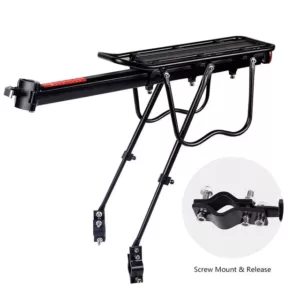 THREO bike rear rack is made of durable aluminum alloy, lightweight yet durable. This carrier suggests loading 50KGs max on your bike, giving priority to cycling safety. However, it looks workable to load an adult’s weight, e.g., even 80KG. It can be used with a pannier, backpack, trunk bag, basket, etc. A quick-release clamp makes the bicycle rack easy to install or remove. Suitable for a seat post with a 26-33mm diameter, and it comes with tools and installation instructions. The support rod can be adjusted 32-44cm, and the seat of the bicycle rear rack can be moved back and forth. It is suitable for road bikes, mountain bikes, etc.