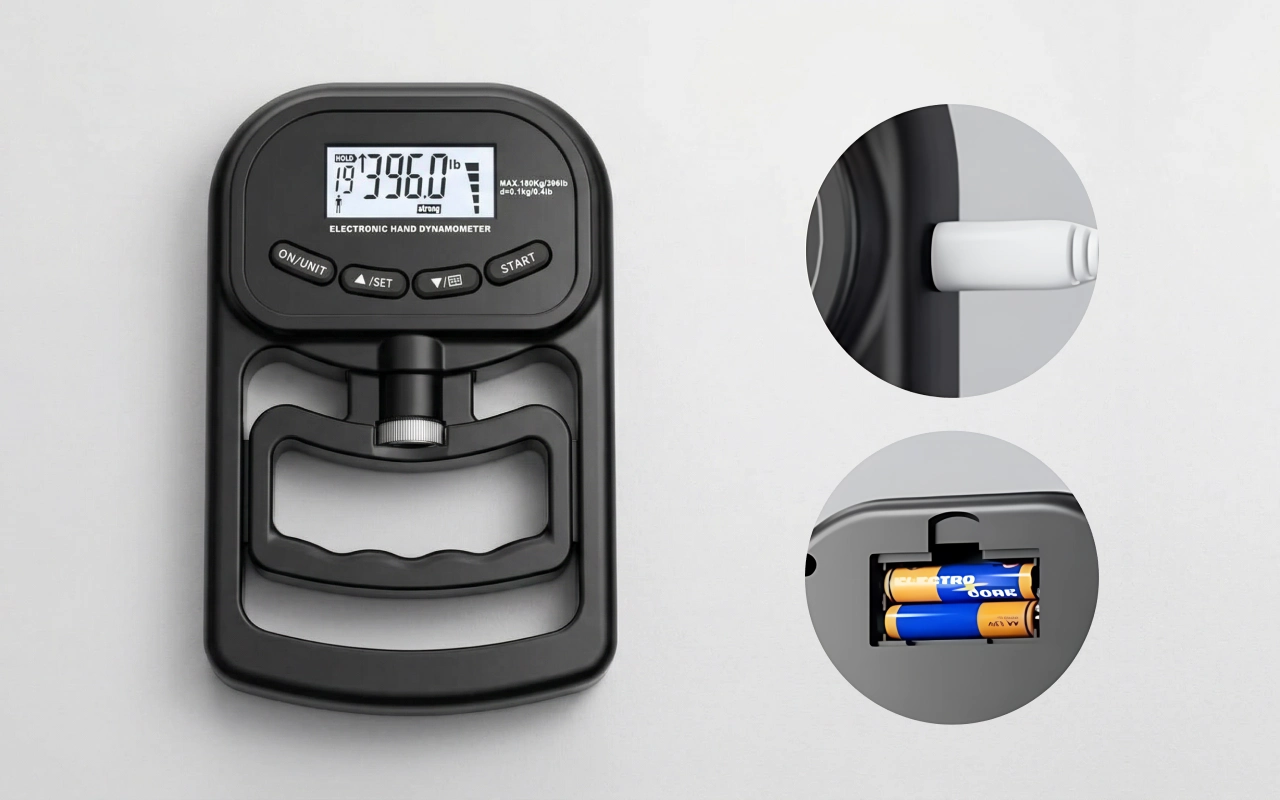 Choose between USB charging or traditional batteries as needed. Keep using the Threo grip dynamometer without worrying about running out of power.