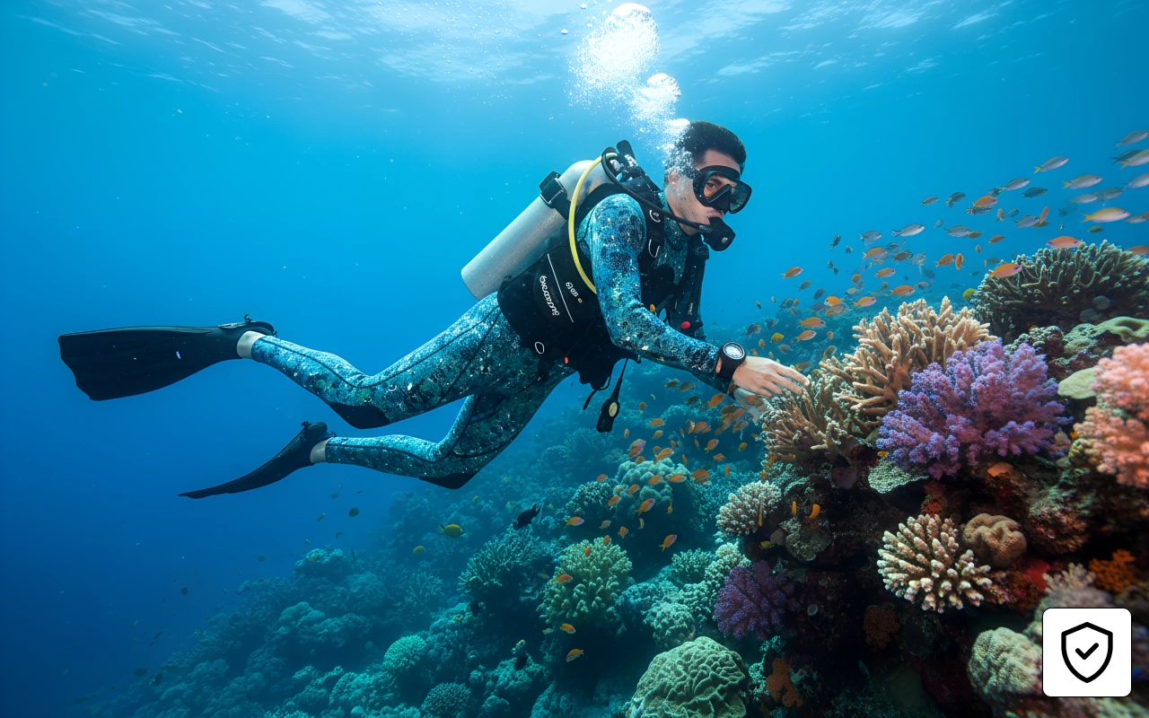 Three-millimetre neoprene keeps your body heat steady. Cold water will not stop your underwater experience.