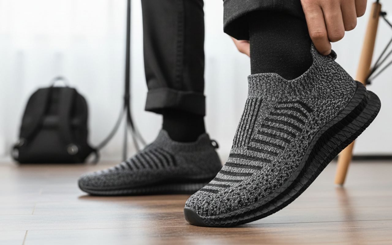 Been wearing these while traveling. Easy to get on and off at airport security, stays comfy for hours, and the grip works well on slick floors.