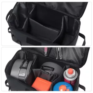 Multiple compartments fit tools, gas, utensils, and cookware easily. Each item stays in place, saving you from digging around.