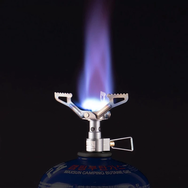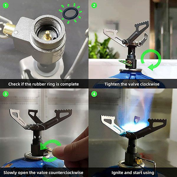The installation of our mini stove is super easy, requires no special tools, and will only take you 10 seconds. Please, observe all precautions and do not allow children to use the product. Make sure the control valve is fully turned off before twisting the stove on. Firstly, tighten the mini stove valve on the fuel canister clockwise using your hands. Then, unfold the top 3 potholders. Finally, open the valve counter-clockwise and start using the mini stove.