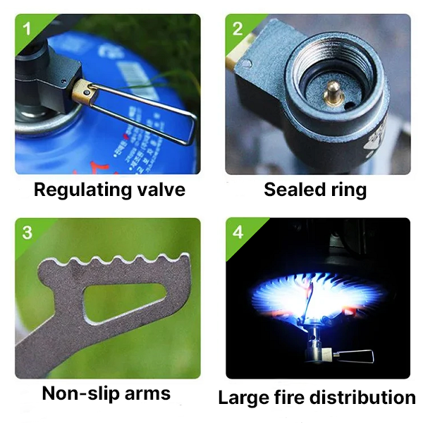 Our device is rather compact and lightweight. Its foldable design and 25 grams weight make it easy to transport and take with you while hiking without adding a burden to your backpack. Our gas stove also features adjustable control valve to realize flame control. It can easily be regulated from a simmer to a full boil by turning the fuel valve clockwise or anticlockwise. Moreover, the THREO Gas Stove is safe to use. It adopts a sealed ring to prevent gas leakage and serrated arms to avoid pot slipping.