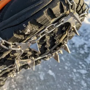 I use these over my work boots at job sites. Ice-covered parking lots don’t scare me now. The metal spikes grip hard-packed snow really well.