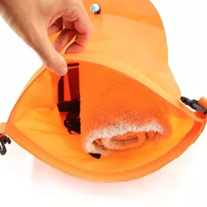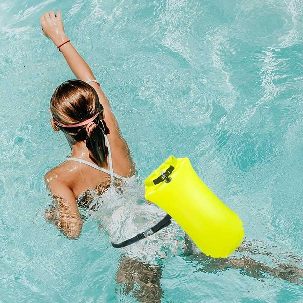 Our swimming buoy is made of durable PVC fabric, which is soft, comfortable, and won’t leak. The strong fabric ensures secure waterproof protection for your belongings. What’s more, this buoy is very easy to use. It has an easy-inflating air nozzle, which can be quickly and easily deflated when needed. Just place your belongings inside the dry bag, roll down the top, clip to close, and inflate to make it float. The buoy’s belt is highly adjustable to fit around your waist.