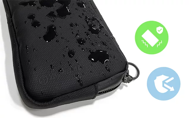 Super roomy, stores my cards, ID, and more without feeling bulky. The water never gets in, not even during heavy showers.